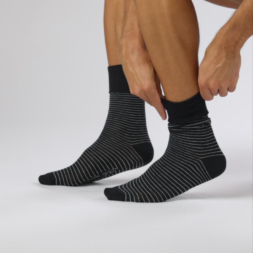 Our Men's Gentle Grip Nova Fine Stripe Cotton Socks in Black are the number one solution for people who find regular socks tight and uncomfortable.