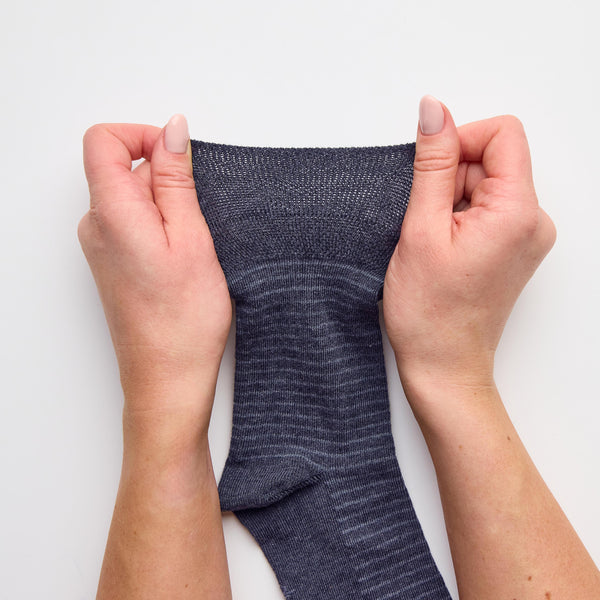 Nos chaussettes en coton à rayures fines Nova Gentle Grip pour hommes en bleu marine/denim sont la solution numéro un pour les personnes qui trouvent les chaussettes ordinaires serrées et inconfortables.